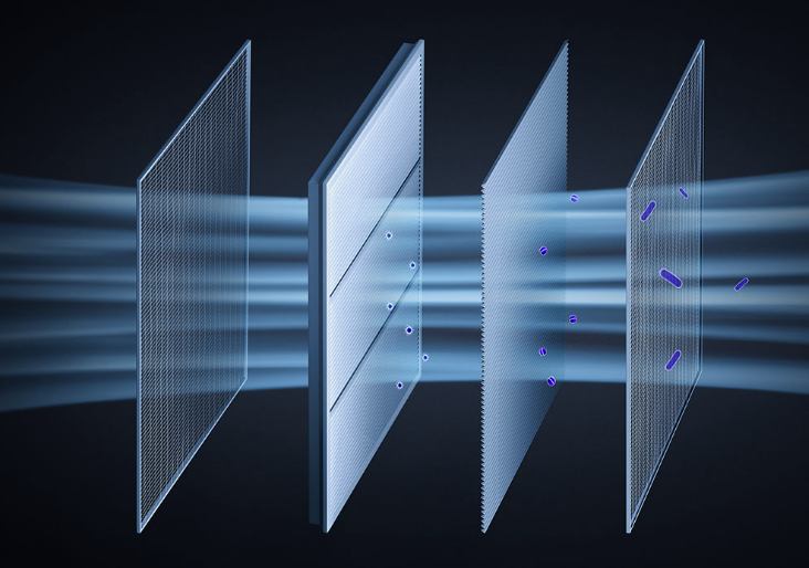 HEPA-фильтр 4-слойная очистка обеспечивает многоуровневую систему фильтрации: 99% степень стерилизации бактерий, 97.3% антивирусная эффективность, ионная очистка — эффективное уничтожение бактерий и вирусов, очистка от формальдегида в реальном времени — защита иммунитета.